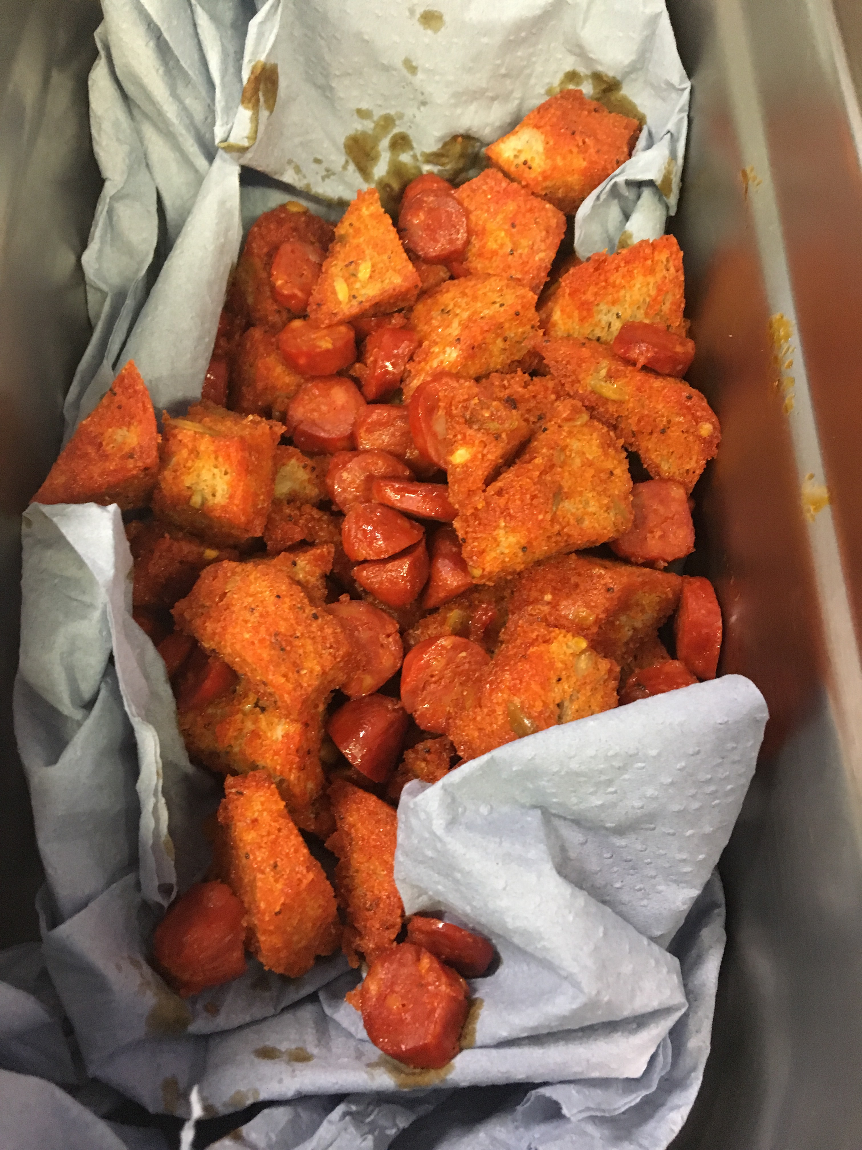 - Now cut your bread into small cubes and add to the pan and stir until the bread soaks up all the oil released from the chorizo. Now pour the contents of the pan out onto a plate or tray covered with a paper towel and leave for ten minutes to remove some of the moisture.