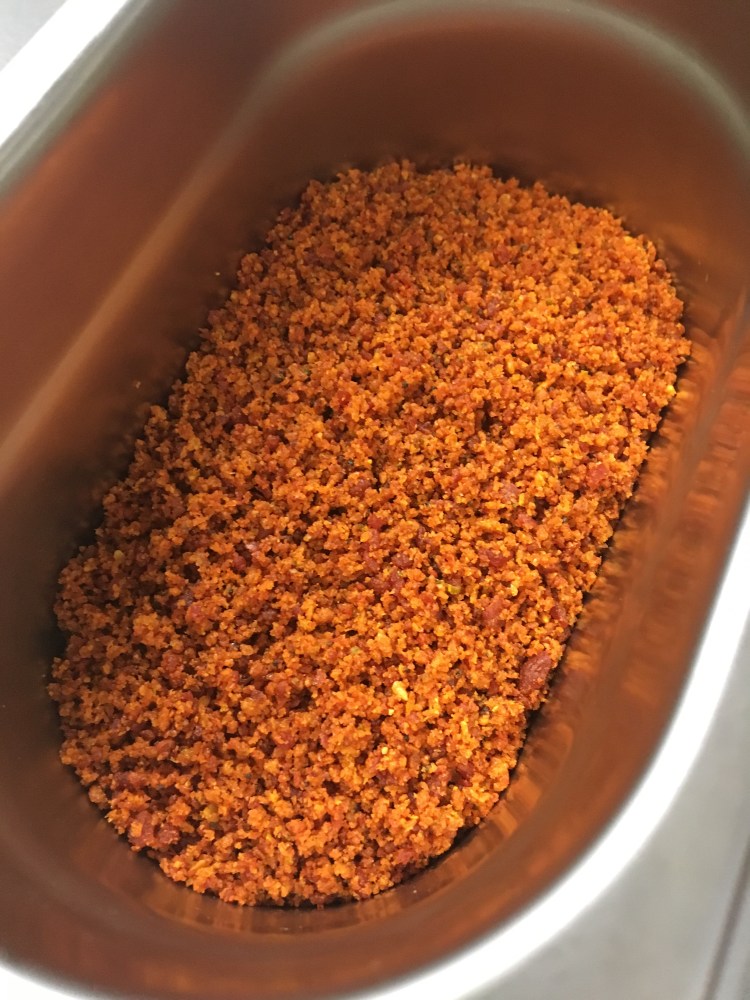 - Place your chorizo and bread mix into a blender and pulse until a crumb. Don’t worry if it’s not as fine as you would like it yet as you will blitz it again once dried out.