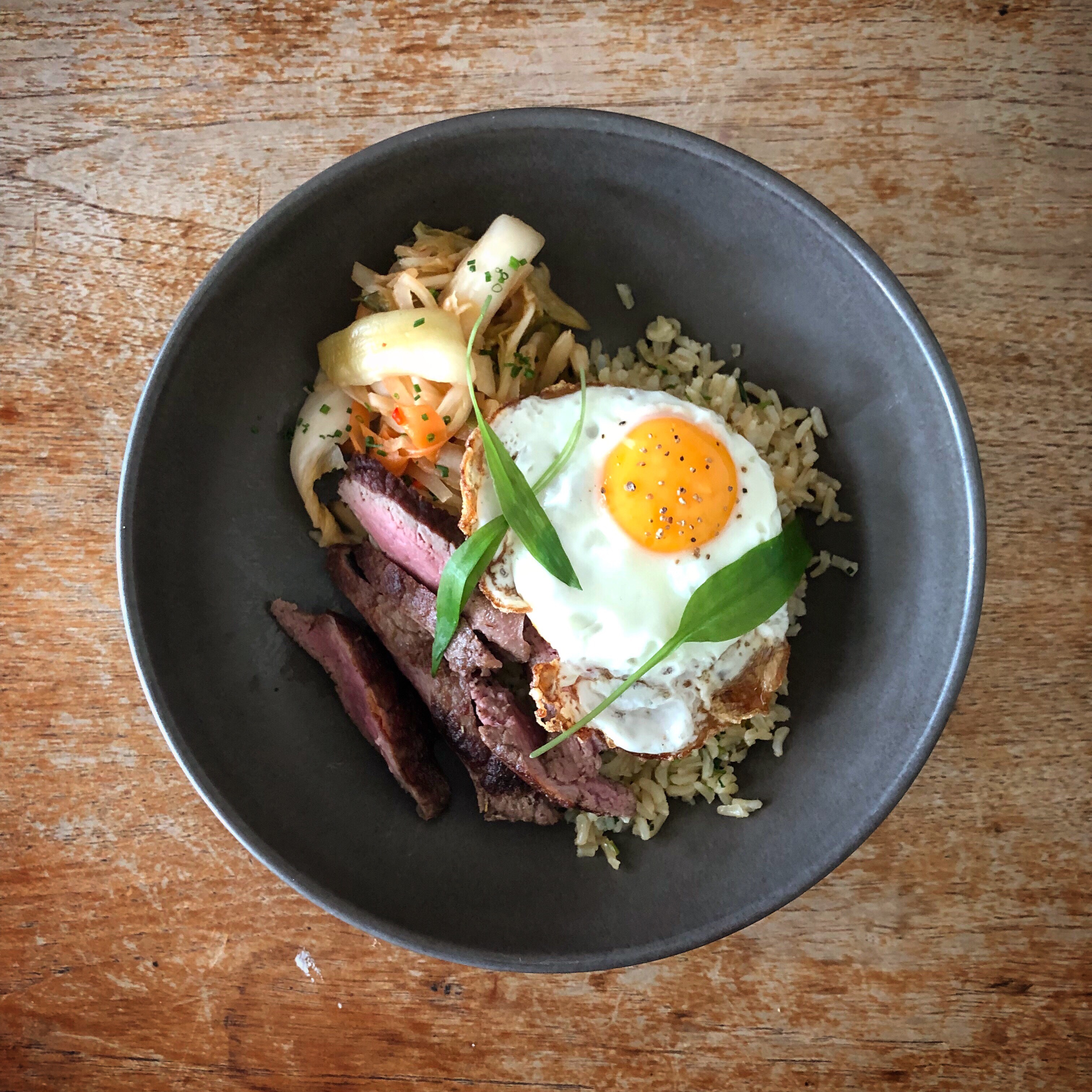Steak / kimchi / brown rice / egg
