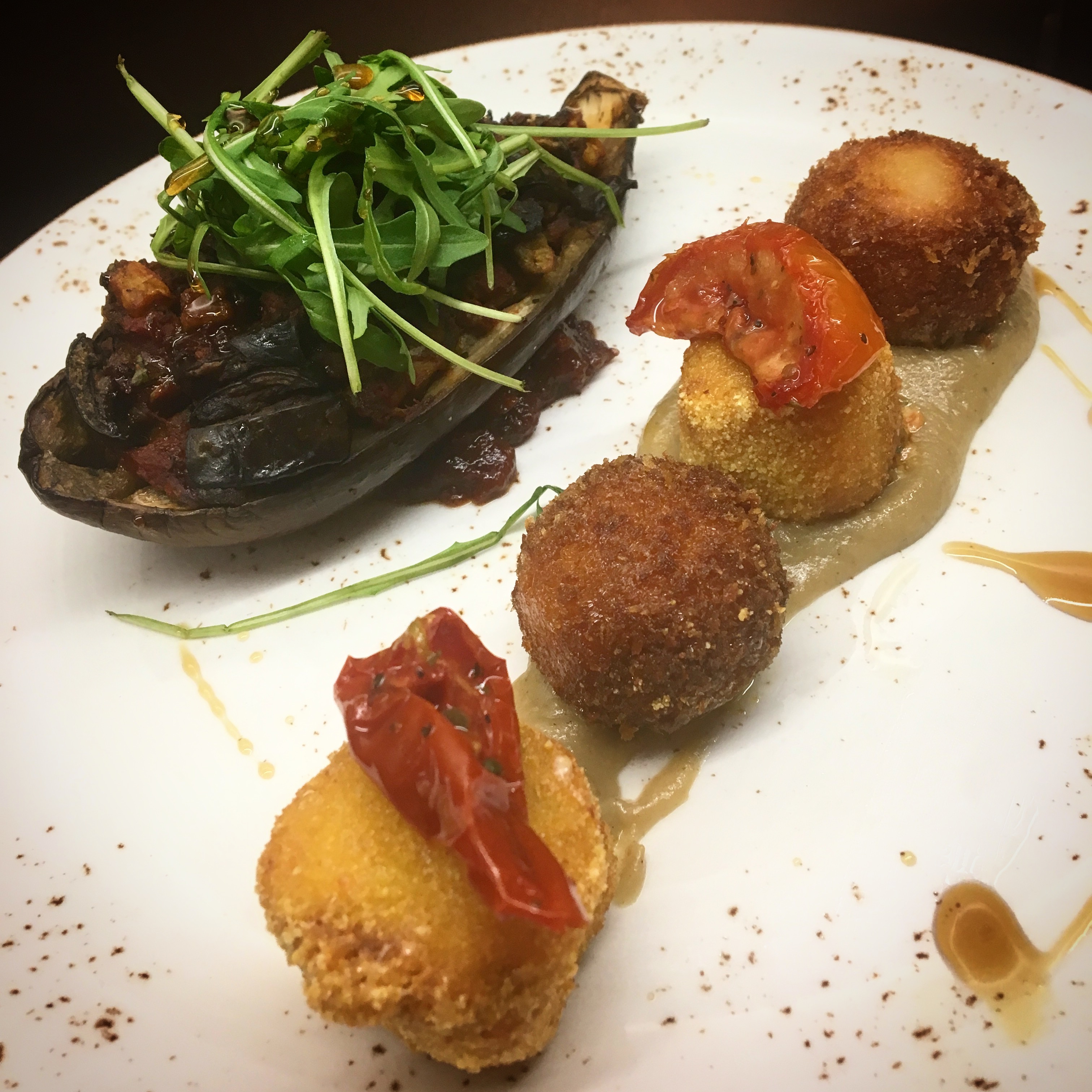 Previous Image Next Image IMG_2951 Imam Bayeldi stuffed Aubergine / Tomato Arrancini / Goats Cheese Truffle Like Loading...