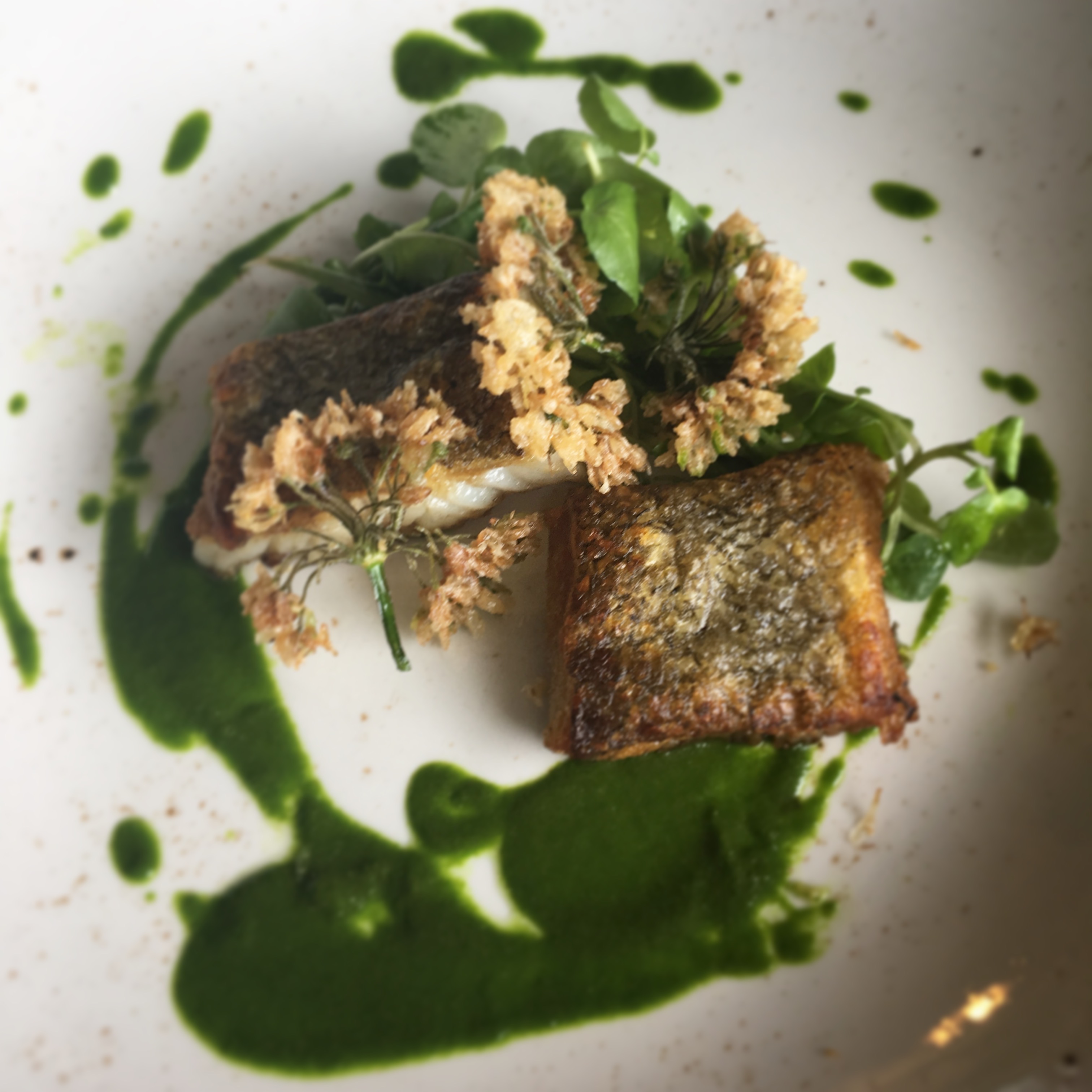 Previous Image Next Image IMG_3517 Pan Seared Hake / Wild Garlic Puree / Tempura Garlic Flower Like Loading...